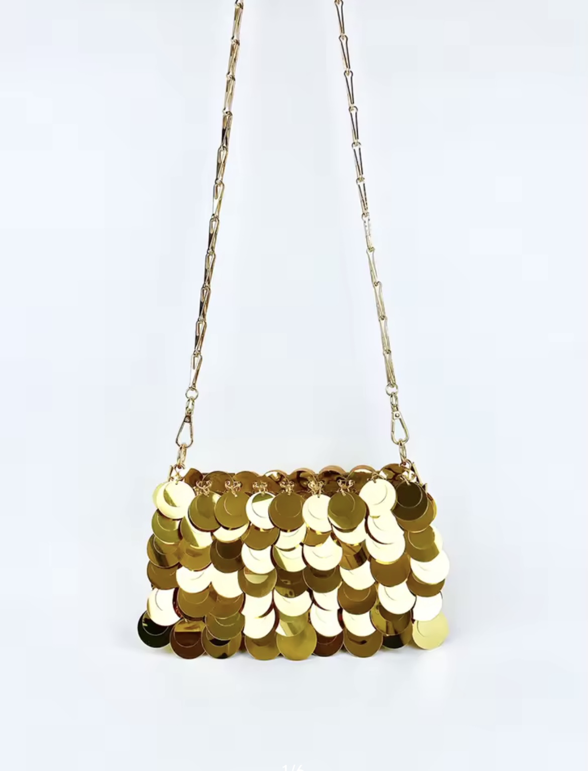 Esta bolsa apresenta um design chamativo e moderno, com lantejoulas douradas grandes que cobrem toda a superfície, criando um efeito de movimento e reflexo ao capturar a luz. As lantejoulas estão dispostas de forma sobreposta, lembrando escamas, o que adiciona textura e profundidade ao acessório.